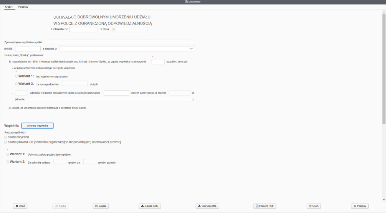 Poniżej przedstawiono wygląd formularza, za pomocą którego należy zgłosić dobrowolne umorzenie udziałów sp z o.o.